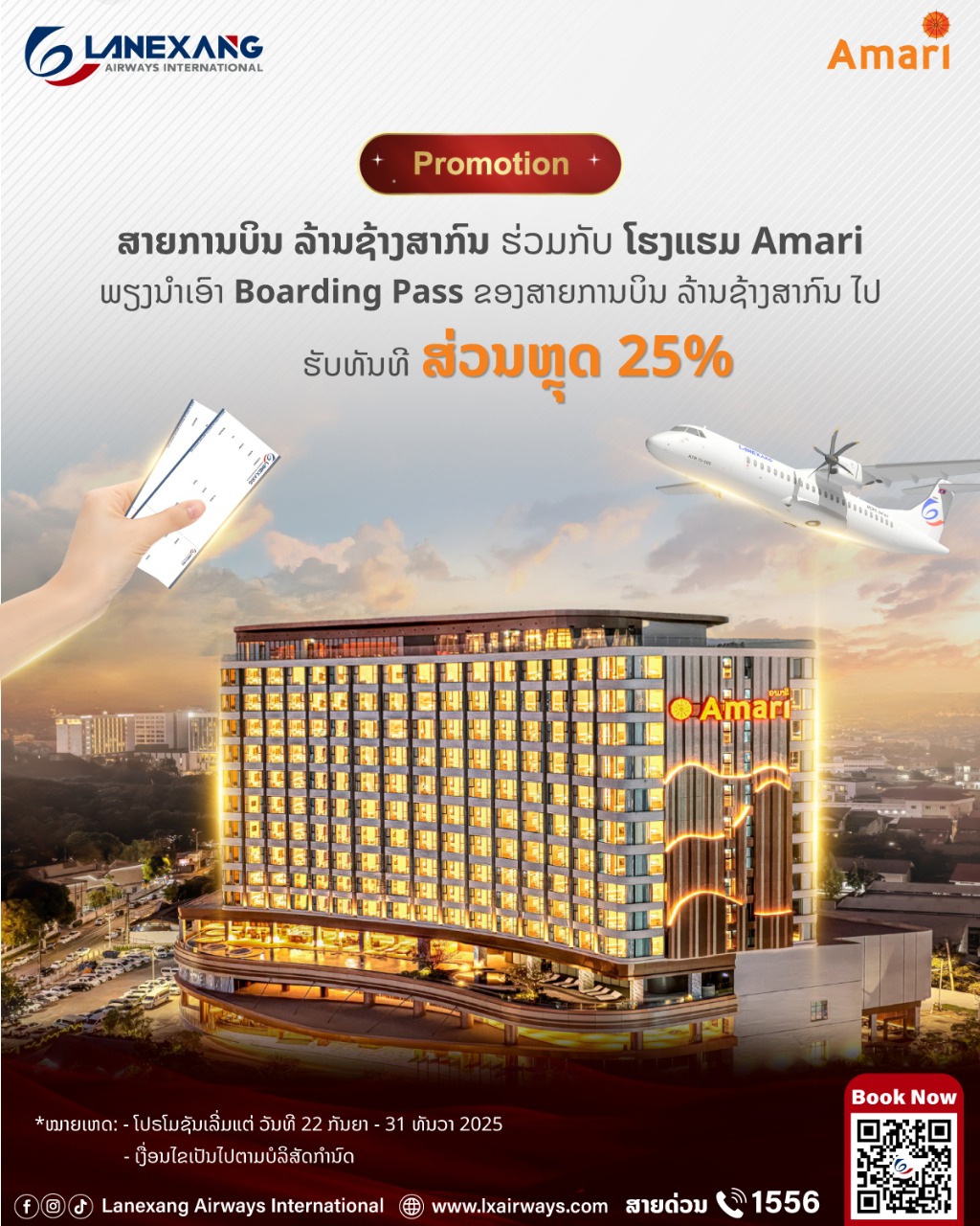 📌 ພຽງສະແດງ Boarding Pass ຂອງສາຍການບິນລ້ານຊ້າງສາກົນທີ່ໂຮງແຮມ Amari ເອົາໄປເລີຍ: